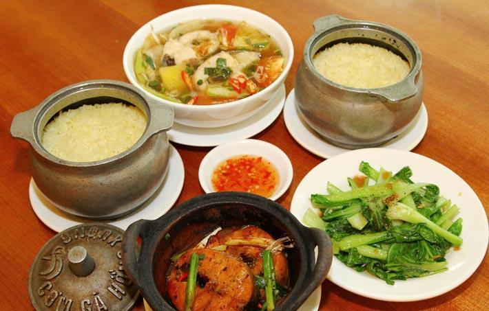 - Set 2: Cá lóc/ cá hú/ cá rô/ cá kèo kho tộ/ thịt nạc kho/ heo quay kho tộ.