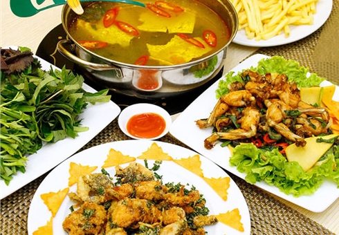 Ở đây, thực khách sẽ được thưởng thức nhiều món ăn mang phong vị ếch các vùng miền như: Ếch rang muối, ếch chiên bơ tỏi, ếch sốt chua ngọt, ếch xào lá lốt, hành nấm, ếch xào măng…Đặc biệt, da ếch - một nguyên liệu thường bị “bỏ qua” cũng được các đầu bếp tận dụng và chế biến thành món ngon lạ miệng không kém cái ngon đậm đà của những “xớ thịt” dai giòn.